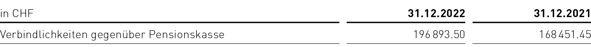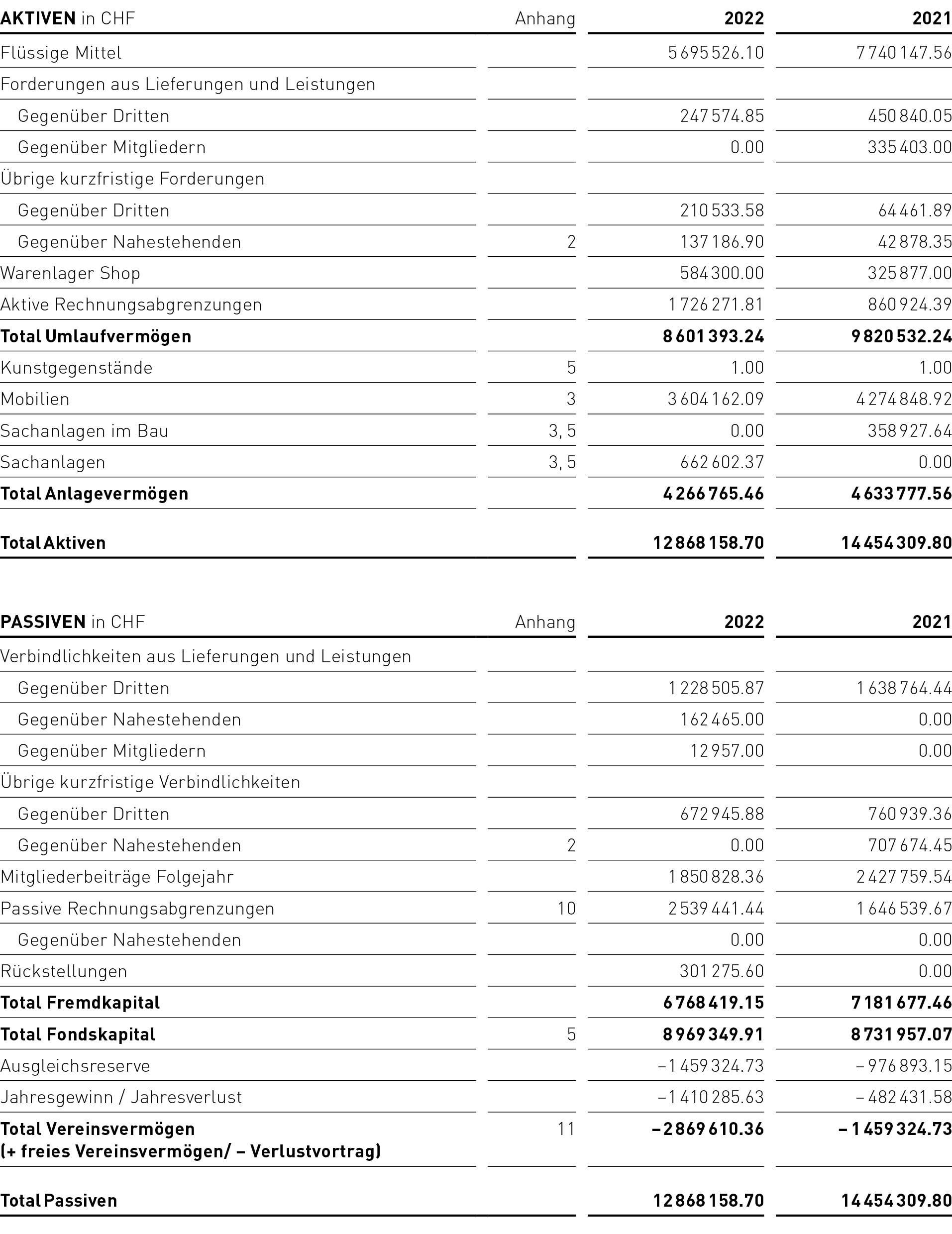 Nach dem starken Anstieg der «passiven Rechnungsabgrenzungen» im Jahr 2021 durch Mitgliedsbeiträge, die bereits für das Folgejahr bezahlt worden waren, ist dieser Betrag mit CHF 1.9 Mio. wieder auf das Niveau der Vorjahre gesunken. Die «passiven Rechnungsabgrenzungen» haben sich allerdings infolge der zu erwartenden Kosten im Zusammenhang mit dem Brandereignis gegenüber dem Vorjahr deutlich erhöht. Langfristige Verbindlichkeiten gegenüber dem Personal sind neu unter der Position «Rückstellungen» zusammengefasst. Mit dem erneuten Verlust im Berichtsjahr wächst das negative Vereinsvermögen auf CHF –2 869 610 an. Der Vorstand der Kunstgesellschaft ist sich bewusst, dass dieser Verlust in den kommenden Jahren ausgeglichen werden muss. Nähere Ausführungen dazu finden Sie im Anhang zur Jahresrechnung Ziff. 11.