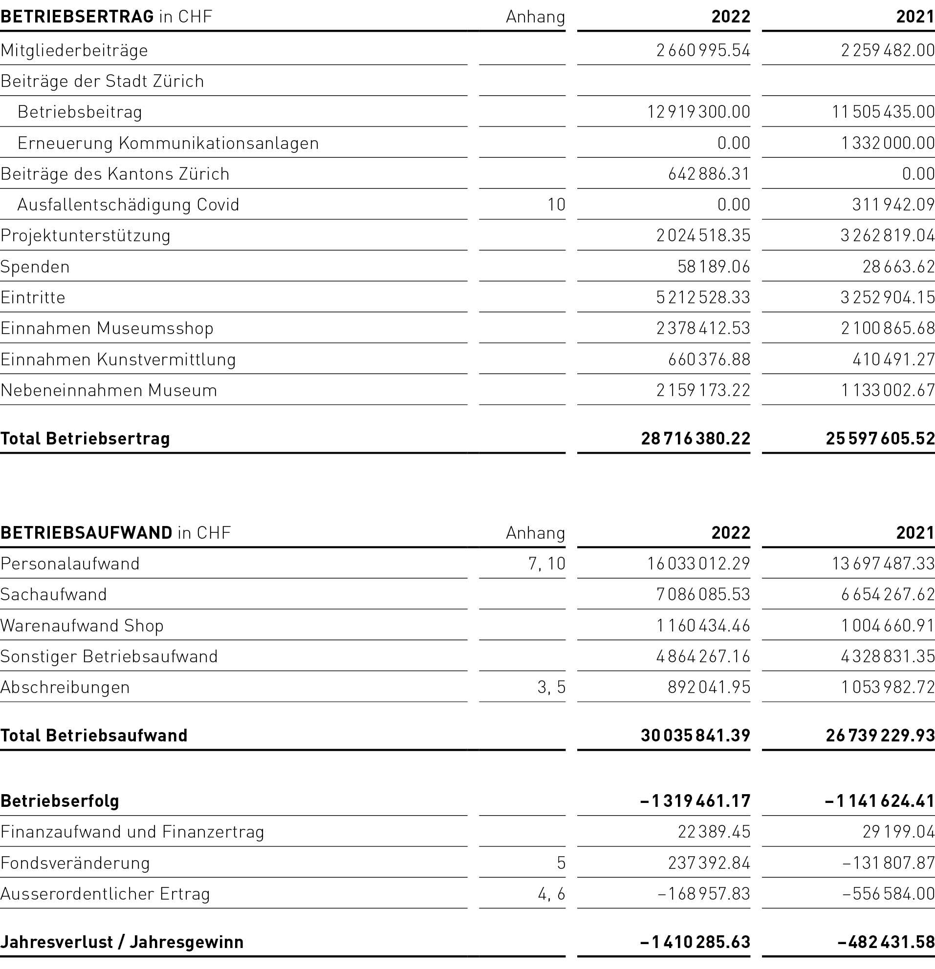 Die Jahresrechnung 2022 schliesst mit einem Verlust von CHF 1 410 285 (Vorjahr CHF 482 431) ab. Das Vorjahresergebnis wurde durch einen a. o. Ertrag von CHF 230 708 aus der Auflösung der Festspielstiftung, durch Kurzarbeitsentschädigungen und Ausfallentschädigungen wegen der Pandemie im Betrag von CHF 778 062 verbessert. Zusätzlich haben wir im 2021 die Warenvorräte der Shops mit CHF 325 876 aktiviert. Im 2022 haben wir die Warenvorräte zu Einkaufspreisen aktiviert und somit den restlichen Warendrittel in der Höhe von CHF 162 938 aufgelöst und damit das Jahresergebnis 2022 leicht verbessert.
