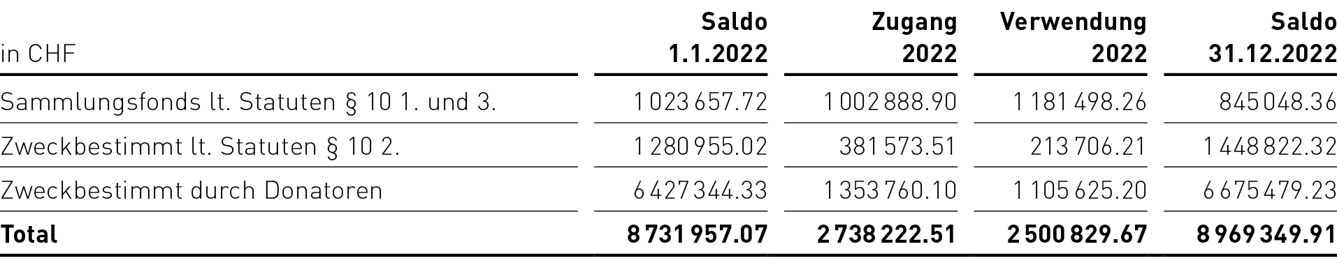 Im Gegensatz zur Abnahme Vorjahr (–CHF 131 807) haben unsere Fonds im Berichtsjahr um CHF 237 392 zugenommen. Details zu unseren Fonds entnehmen Sie bitte dem Anhang Ziff. 5.