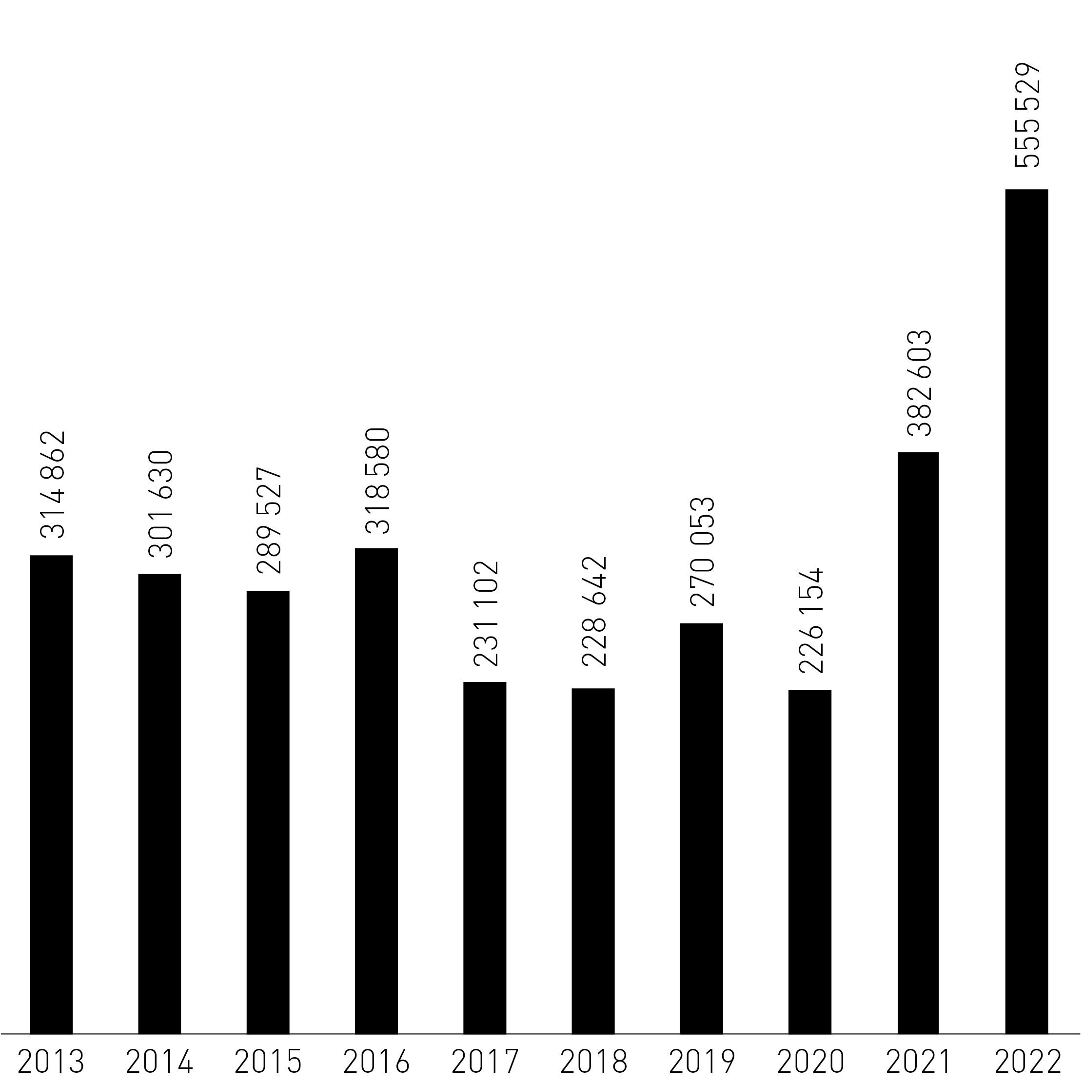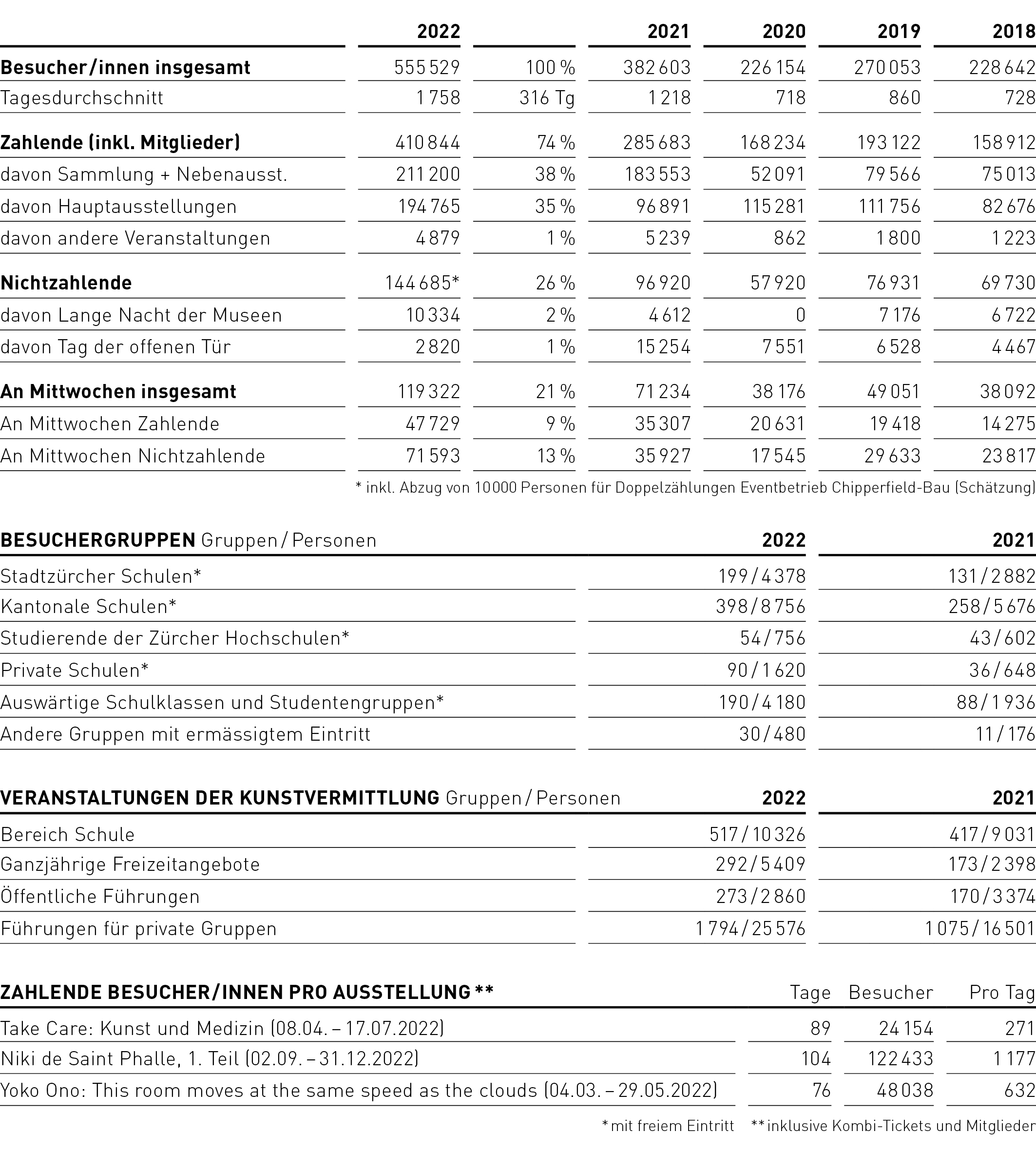 Im ersten kompletten Betriebsjahr seit Eröffnung des Chipperfield-Baus übertrafen die Besucherzahlen des Kunsthauses alle Erwartungen. Der seit 1982 lange gehaltene Rekord von 504 000 Personen wurde mit 555 500 Besuchenden in 2022 bei Weitem übertroffen (Zahlen sind abgerundet). Dies entspricht einer Steigerung gegenüber dem Vorjahr (382 600) von rund 45 Prozent. Zu diesem historischen Erfolg haben verschiedene Faktoren beigetragen: Die sehr erfolgreiche Ausstellung «Niki de Saint Phalle» mit knapp 1400 Besuchenden pro Tag war erwartungsgemäss der grösste Publikumsmagnet. Der im Vorjahr eröffnete Chipperfield-Bau erfreute sich zudem beim Publikum weiterhin grosser Beliebtheit. Dazu beigetragen hat auch die Kontroverse rund um die Sammlung Emil Bührle. Schritt für Schritt haben auch wieder mehr Touristen das Kunsthaus besucht, nachdem dieser Personenkreis pandemiebedingt zwei Jahre stark untervertreten war. Auch im Berichtsjahr waren die abwechslungsreichen Veranstaltungen der Kunstvermittlung sehr gut besucht. Workshops für Kinder und Familien waren fast das ganze Jahr über ausgebucht und die vielen öffentlichen Führungen waren sehr oft bereits via Online-Ticketing im Vorfeld ausgebucht. Wie auch im Vorjahr hat das Vermietungsgeschäft an allen Standorten für eine Vielzahl zusätzlicher Museumsgäste gesorgt (Führungen, Miete Museum etc.). «Last but not least» hat die historisch hohe Anzahl Mitglieder (25 800) im Berichtsjahr ebenfalls zu vielen Museumsbesuchen geführt.