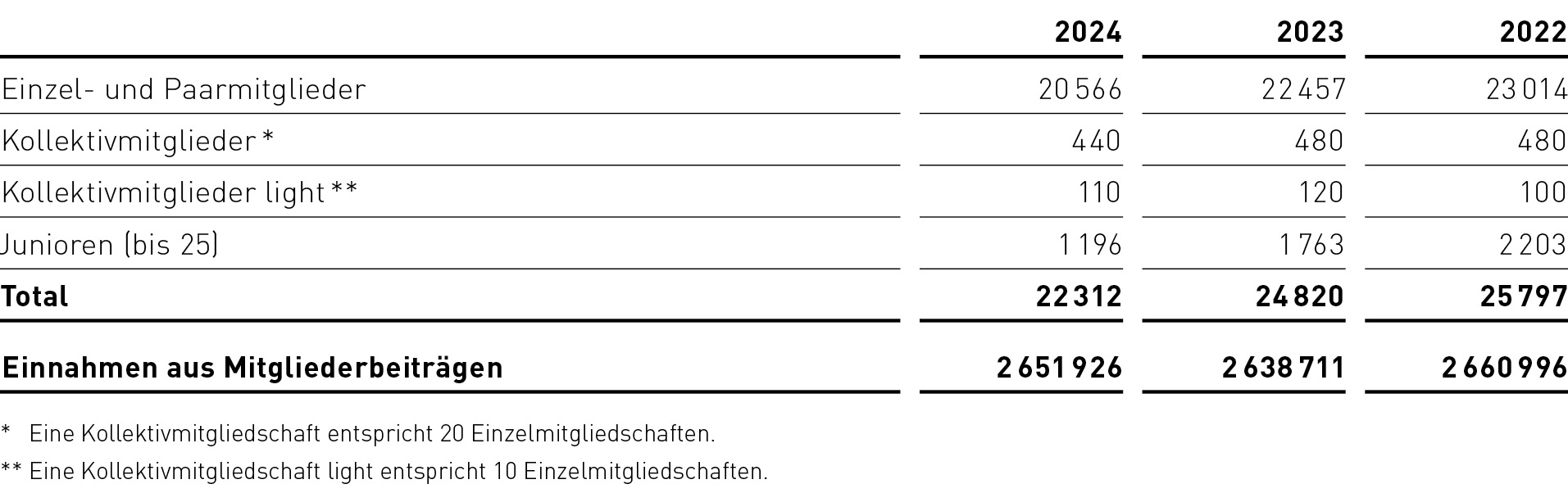 Trotz des merkbaren Rückgangs der Mitgliederzahlen konnten im Jahr 2024 leicht höhere Einnahmen im Vergleich zum Vorjahr erzielt werden. Die Einnahmen blieben mit einem Anstieg um CHF 13 215 ungefähr auf dem Niveau des Vorjahres. Dieser leichte Zuwachs in Relation zur Anzahl der Mitglieder bedeutet eine Erhöhung des Erlöses pro Mitgliedschaft von CHF 135.67 auf CHF 159. Ausschlaggebend ist hier das Auslaufen der Vergünstigung für langjährige Mitglieder und ein einheitlicher Mitgliederbeitrag von CHF 135 für die Einzel- sowie CHF 225 für die Paarmitgliedschaft.